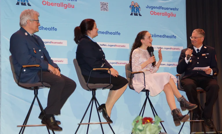 Bild 3: Im Interview mit Kreis-Jugendfeuerwehrwart Florian Speigl: v.li. Kommandant Gerold Walker, Feuerwehr Altusried, Karoline Nägele, Jugendwartin der Jugendfeuerwehr Oy-Mittelberg, Carmen Allgayer, Hauptdarstellerin und Mitglied der Jugendfeuerwehr Oy-Mittelberg