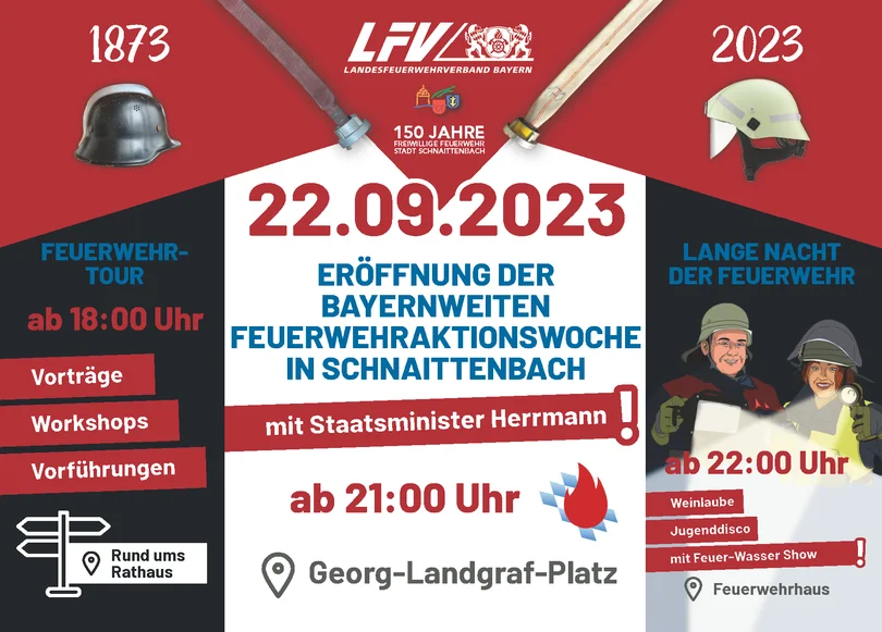 Für den Auftakt der Feuerwehraktionswoche 2023 am 23.September sind alle Feuerwehren herzlich eingeladen, mit der bayernweiten "Langen Nacht der Feuerwehr" gemeinsam die Feuerwehren öffentlich sichtbar zu machen und für dieses wunderbare Ehrenamt zu werben.